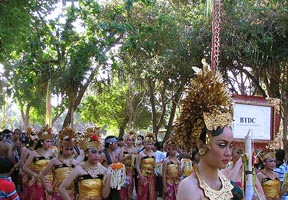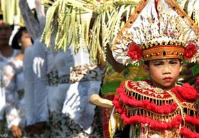 The Kuningan Festival is an important festival of the Saka year - it's the last day of the year, and usually falls towards the end of March. The day is set aside as a day of purification. In the night, evil spirits are driven away with cymbals, gongs, drums and flaming torches. It is followed by Nyepi, the Hindu New Year, where everyone stays quietly at home, making no noise, using no lights and doing no cooking. The idea is that when evil spirits descend, they are fooled into thinking that Bali is uninhabited and leave the island in peace for another year.