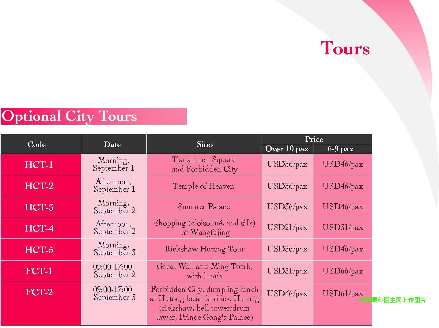 1. Buses for the Optional City Tours will leave for tours from the Beijing International Convention Center, and will return to the Beijing International Convention Center. The quotations include an English-speaking guide, meals if specified, air conditional coaches and admission fees.