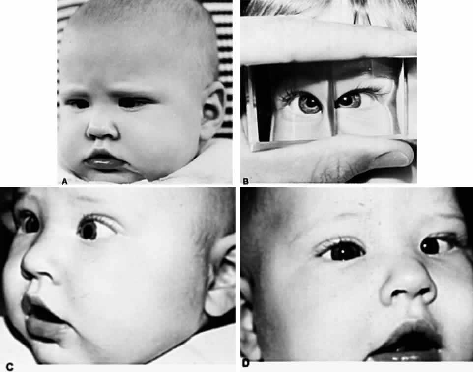 an esophoria or an esotropia. The cause of nonaccommodative esodeviations is neurogenic and anatomic. The innervating factor that causes convergence other than accommodative and fusional convergence is known as tonic convergence. Accordingly, the innervational cause of nonaccommodative esotropia is reasoned to be some vague disturbance within the tonic vergences, resulting in either excessive tonic convergence or deficient tonic divergence. It is convenient, although unproved, to use this speculation to explain both congenital esotropia and the esotropia that gradually develops secondary to an anomaly that impairs the sight in one or both eyes of infants and young children. The anatomic factors that probably account for some of the nonaccommodative esodeviation problems are primary anomalies, such as abnormal medial rectus muscles; and secondary anomalies, such as the change that occurs in the medial rectus muscles with excessive innervation, as is encountered in deteriorated accommodative esotropia, abducens palsy, and Duane syndrome. CONGENITAL ESOTROPIA The term congenital esotropia has been criticized as improper by some authors, who argue that these patients cannot be proved to have been born with esotropia.21,22 The basis for this criticism is that the deviation is not present at birth. Based on clinical observations, however, the term congenital esotropia is valid, and it can be easily distinguished from other forms of acquired esotropia.23 Congenital esotropia is usually apparent to the parents shortly after the child's birth. After the first few days of life, when the eyes are open sufficiently for study, the esotropia is detected. Some parents claim the esotropia was not obvious until 1 or 2 months later, but the onset of esodeviation is open to subjective analysis, and it is difficult for the physician to procure good objective analysis. Nixon and co-workers24 observed 1219 alert infants in a newborn nursery to learn whether esotropia is present at birth or develops later in infancy. Orthophoria was found in 593 (48.6%), exotropia in 398 (32.7%), intermittent esodeviations in 17 (1.4%), varying between esodeviations and exodeviations in 14 (1.1%), and variable esodeviations in 9 (0.7%). None of the infants had findings diagnostic of congenital/infantile esotropia. The authors concluded that congenital/infantile esotropia is not present at birth, but develops in the first few weeks to months after birth. Maumenee and associates25 analyzed 173 pedigrees involving 1589 people in an effort to determine the etiology of congenital esotropia. Their results were compatible with a mendelian codominant model, but the estimated transmission probability was not consistent with the mendelian expectation. This suggested that these families had etiologic heterogeneity, the majority being autosomal recessive and some dominant; there may have also been an aggregation of some nongenetic cases. The prevalence of the monofixation syndrome in the general population is approximately 1%. Scott and colleagues26 studied 90 children with congenital esotropia, and 129 of the biological parents. Twelve parents had secondary monofixation syndrome, which reduced the numbers studied to 117 parents and 78 patients. Of the 117 parents, 7 had primary monofixation syndrome, yielding a prevalence of 6% for the parents and 9% (7/78) for the families. Because congenital esotropia is most likely inherited in a multifactorial fashion, the authors believe that the increase in prevalence of primary monofixation syndrome compared with the general population supports the hypothesis that primary monofixation syndrome may be a mild subthreshold effect of the gene or genes responsible for congenital esotropia. Characteristically, the angle of convergence is large and constant, showing little sign of change with age in children without brain damage. A high percentage of brain-damaged infants have congenital esotropia, but their angle of strabismus is usually more variable, frequently diminishing with age; occasionally, the esotropia is spontaneously replaced with exotropia between 6 months and 1 year of age. In a study of patients with infantile esotropia, Holman and Merritt27 found neurologic problems, both general and ocular, in 29 of 47 patients (62%). Problems included prematurity, hydrocephalus, mental retardation, cerebral palsy, meningomyelocele, intraventricular hemorrhage, neonatal and postnatal seizures, and abducens palsy. The authors believed that the high incidence of neurologic problems was, in part, due to the fact that the study was conducted at a university medical center. Nelson and co-workers28 found a prevalence of strabismus of 24% in 29 infants who were prenatally exposed to various psychoactive drugs: 14% had esotropia and 10% had exotropia, which is high compared with the incidence of strabismus in the general population (2.8% to 5.3%). Patients with congenital esotropia must be differentiated from those with very early onset accommodative esotropia who present with a large-angle esodeviation or variable deviation combined with hypermetropia in the range of + 3.75 D to + 7.5.D.29 Diagnosis The majority of patients with congenital esotropia alternate fixation in the primary position and cross-fixate on side gaze, using the right eye in left gaze and the left eye in right gaze, as illustrated in Figure 3. The minority who happen not to alternate their fixation have amblyopia in the nonpreferred eye, which may be profound, as manifest by eccentric fixation. The cross-fixation pattern can be confusing and misleading to the examiner who is not experienced in examining infants with congenital esotropia. The examiner must learn that the absence of the abduction so frequently encountered in these infants is secondary to the cross-fixation habit. The infant who cross-fixates has never abducted an eye, and the examiner finds it impossible to evoke an abduction response on either version or duction studies. The