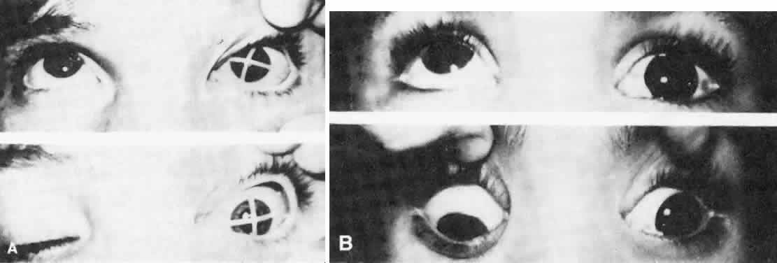 frequently in adults than in children. However, in a retrospective study, Ing and co-workers5 evaluated 54 children with oculomotor nerve (CNIII) palsy, presenting over a period of 21 years, and found 38 isolated third CN lesions and 16 with additional CNs involved. Only 11 cases were congenital, and of the 43 that were acquired, 31 were traumatic, 7 related to infection, 2 ophthalmoplegic migraine, 2 neoplastic, and 1 vascular-hypertensive. In contrast with adults, this series did not include any third CN palsy secondary to aneurysm, diabetes, metastatic tumors, or pituitary lesions. CONGENITAL Congenital third CN palsy presents with varied degrees of extraocular involvement. Intraocular musculature is not usually affected in congenital third CN palsy, although pupil constriction may occur on attempted adduction in some cases of aberrant regeneration.6,7 The involved pupil may even be smaller than the uninvolved eye in congenital third CN misdirection syndrome.8 Although congenital third CN palsies are considered to be benign and isolated, Balkan and Hoyt9 reported other signs of focal neurologic damage, including pupillary involvement, oculomotor synkinesis, hemiplegia, seizures, and developmental delay.9 These congenital third CN palsies probably occur as a result of damage to both the peripheral nerve and the brain stem.9 Balkan and Hoyt found neurologic involvement or developmental delay in 7 of 10 patients studied. Hamed10 described neurologic involvement in 10 of 14 cases with congenital oculomotor palsy, and Tsaloumas and Willshaw11 reported 5 of 14 patients with congenital oculomotor palsy with significant neurologic abnormalities, including 2 patients using digital lid elevation to allow fixation with their affected eye. The degree of involvement of the levator muscle varies, but some function is usually retained. Therefore, ptosis is variable in this form of third CN palsy. The four extraocular muscles innervated by the third CN are also affected in various degrees. However, there is usually some trace at least of weakness of the medial, inferior, and superior rectus muscles, and of the inferior oblique muscle. The fourth CN is uninvolved and, consequently, the involved eye is exotropic and hypotropic (Fig. 1). Therefore, the clinician should always suspect congenital third CN palsy in an exotropic patient who has one low eye, intact pupillary and accommodation responses, and minimal ptosis of the involved eye with varied degrees of limitation of both elevation and depression in addition to diminished adduction. Many of these patients are able to develop single binocular vision and to maintain a compensatory malposition of the head that allows the alignment of the eyes to serve this purpose. When the eyes are moved into a position in which fusion is not possible, these patients experience diplopia if they have binocular vision with torticollis. Amblyopia of either eye may occur if the patient does not have binocular vision and does not maintain torticollis. Schumacher-Feero and coworkers12 reported a series of 49 children with third CN palsy, involving 53 eyes, and observed during a follow-up for a mean of 5.5 years. Amblyopia developed in 27 eyes, and at the last follow-up visit, in 56% of affected eyes, the visual acuity ranged from 20/15 to 20/40. Binocular function was difficult to restore or to preserve but was significantly improved after surgery. Horizontal alignment was initially good in 6 of 49 patients, improving to 30 with good alignment at their last evaluation. The vertical alignment improved from 24 initially to 35 with good alignment at their last evaluation. Only 1 child achieved fusion at distance and near after a single recession/resection procedure at 8 months of age. A complete palsy required a mean of 2.3 operations to align the eyes, and a partial third CN palsy required a mean of 1.5 operations over the 5.5-year period. In general, the surgery was a horizontal recession/resection procedure for exotropia, with graded supraplacement of the horizontal rectus insertions for the hypotropia. The cause of congenital third CN palsy is unknown, but it is presumed to be due to a developmental defect in either the nuclear or the motor fiber portion of the third CN complex that innervates the levator muscle and the extraocular muscles. It is not an extremely rare motility disorder. We have seen many patients having only unilateral involvement. As in any third CN palsy, the absence of adduction of the involved eye makes it difficult to determine the intactness of the ipsilateral CN nerve. Clinically, the method used is to observe the crypts of the iris while the involved eye remains abducted and to ask the patient to look upward and downward. If the fourth CN is intact, the iris markings reveal a conspicuous intorsion as infraduction is attempted and extorsion as supraduction of the involved eye is attempted (Fig. 2). Dieterich and Brandt13 measured ocular torsion and subjective visual vertical tilts in acute and chronic oculomotor, trochlear, and abducens nerve palsies for each eye separately in the primary position with the head held upright. Unexpectedly, ocular torsion was abnormal in only 32% of third and fourth CN palsies involving oblique eye muscles, and normal in all abducens palsies. When measurable, pathologic ocular torsion was low, from 2 to 8 degrees, monocular, involving either the paretic or nonparetic eye. Subjective visual vertical tilts were abnormal in 67% of third and fourth CN palsies, mostly low in amplitude, between 1 and 6 degrees, and involving either the paretic or nonparetic eye, depending on the duration of the palsy. In contrast with acute unilateral brain-stem lesions with frequent binocular and conjugate tilts, third and fourth CN palsies cause only minor and unpredictable ocular torsion and subjective visual vertical tilts.