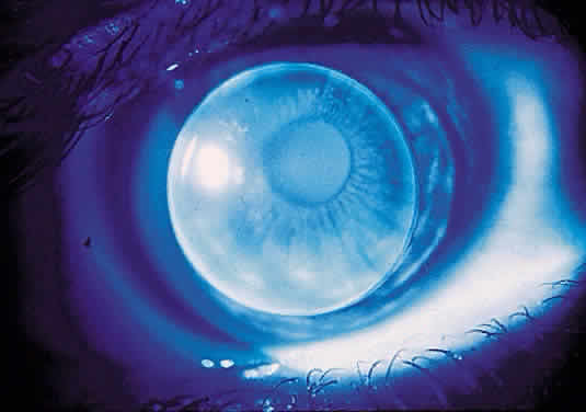 Fig. 8. Contact lens fitted “steeper than K.” Note the “plus” tear lens beneath the contact lens.