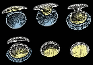 PRIMARY FIBER FORMATION Lens formation begins in the latter part of the first trimester as surface ectodermal cells, immediately overlying the developing optic vesicle, are induced to thicken and form the lens placode (Fig. 1). As the optic vesicle begins to fold inward and form the optic cup, the lens placode invaginates toward the developing optic cup until it eventually pinches off as an inverted (inside-out) lens vesicle. The apical surfaces of the lens vesicle cells are directed toward the lumen, whereas their basal surfaces are directed toward the outer surface. Throughout life, the basal surfaces of lens cells produce a progressively thicker basement membrane, the lens capsule, that envelops the lens. Lens development proceeds as cells of the lens vesicle approximating its retinal half are induced to terminally differentiate. A striking consequence of lens terminal differentiation is that the originally cuboidal lens vesicle cells are transformed into long fiber-like cells, or fibers. Fiber elongation proceeds until they fill in the lumen of the lens vesicle. Because these fibers are the first lens cells to be transformed into fibers, they are referred to as the primary fibers. SECONDARY FIBER FORMATION The cells of the lens vesicle that were not induced to form primary fibers remain as a monolayer, the lens epithelium, that covers the anterior surface of the primary fiber mass. Lens development and growth continues throughout life, in a manner similar to other stratified epithelia with the lens epithelium constituting the basal layer. However, whereas typically stratified epithelia have their progenitor cells distributed throughout the basal layer, the lens is unique in that its progenitor cells are sequestered as a distinct subpopulation within the lens epithelium known as the germinative zone (GZ). The remainder of the lens epithelial cells are sequestered in three additional regions known as the central zone (CZ), pregerminative zone (PGZ), and transitional zone (TZ). CZ epithelial cells comprise a broad polar cap of the lens epithelium covering most (approximately 80%) of the anterior surface of the lens. These cells are arrested in the G0 stage of the cell cycle and are not recruited to terminally differentiate into fibers.1 PGZ cells comprise a narrow, latitudinal band (approximately 5% of the lens epithelium) peripheral to the CZ. Although a small number of these cells undergo mitotic division, only rarely are any of their daughter cells induced to terminally differentiate and become additional fibers. Rather, these daughter cells add to the lens epithelial population as the anterior surface of the lens increases in size because of continued growth and aging.2,3 GZ cells comprise a narrow, latitudinal band (approximately 10% of the lens epithelium) peripheral to the PGZ. These cells undergo mitotic division, and some daughter cells are selected to terminally differentiate into additional fibers. Because these are the second fibers to develop, they are referred to as secondary fibers. Finally, TZ cells comprise a narrow, latitudinal band (approximately 5% of the lens epithelium) peripheral to the GZ. These cells are the nascent fibers having already begun the process of elongation. FIBER ELONGATION The secondary fibers comprise the layers, or strata, of the lens. An understanding of how fibers are added onto the existing lens throughout life is necessary to comprehend the complex structure of the lens that is paramount in the establishment and maintenance of its transparency (Fig. 2). As the cells within the TZ migrate posteriorly, they rotate 90 degrees about their polar axis while elongating bidirectionally. As fiber elongation continues, the anterior ends are insinuated between the lens epithelium and the primary fiber mass while the posterior ends are insinuated between the primary fiber mass and the posterior lens capsule. Elongation is complete when the anterior and posterior ends of newly formed secondary fibers break contact with the apical surfaces of CZ epithelial cells anteriorly and the capsule posteriorly, respectively.The fact that all fibers detach from the basement membrane, the lens capsule, is direct evidence that the lens is a stratified, rather than a simple epithelium because in simple epithelia, all cells permanently retain contact with the basement membrane. The anterior ends of fully elongated fibers abut and overlap with one another, as do the posterior ends, to form a growth shell. Because secondary fiber formation, or stratification, occurs throughout life, the net result is the establishment of successive growth shells, surrounding the original primary fiber mass. Thus, a view through a lens split along its anteroposterior or visual axis reveals concentric growth shells and/or radial cell columns (Fig. 3). The inside-out development scheme of the lens dictates that growth shells become progressively more internalized and, therefore, fibers cannot be sloughed off. In fact, all primary and secondary fibers formed are retained and must be supported for a lifetime. Failure to preserve the viability of any fiber is presumed to lead to pathology. After fiber elongation is complete, terminal differentiation continues as the newly formed fibers routinely eliminate their nuclei, Golgi bodies, rough endoplasmic reticulum, and most smooth endoplasmic reticulum and mitochondria.4–11 The removal of these organelles is often described as necessary because their retention would cause a significant diffraction of light and thereby compromise lens function. However, it should be noted that other stratified epithelia (e.g., skin) also routinely eliminate these same organelles from cells in upper or older layers as a function of terminal differentiation. Fiber maturation continues with the production of specialized cytoplasmic proteins, the crystallins, as well as specialized cytoskeletal and plasma membrane components. As fibers age, the structural and biochemic