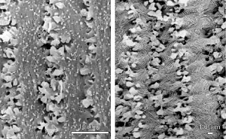 Although scanning electron microscopy does not provide sufficient resolution to resolve the previously described junctional complexes, it does provide a superior overview of the density of the different gross fiber membrane configurations (flat, low- and high-amplitude fiber membranes) characterized by fiber gap junctions and TAJs, respectively. In all lenses, after the elongation and terminal differentiation processes are completed, the smooth lateral membranes of fibers are radically altered. Scanning electron microscopy (SEM) reveals that mature and aged fiber membranes become characterized by numerous polygonal domains of furrowed membrane (Fig. 16). These domains are the high-amplitude undulating membranes as seen in thin-section and freeze-etch electron microscopy.53,54 The fact that the character of fiber membrane varies as a function of maturity and age has led to speculation that this is the result of the AQP0 channels being redistributed within the plane of the membrane. The functional significance of such a dramatic remodeling of fiber membrane is unknown. LENS FIBER CELL-TO-CELL FUSION Closely apposed regions of lateral membrane from neighboring fibers are frequently fused for a variable distance along the fiber length.25,55–57 Fusion zones are frequently seen to occur between the anterior segments or posterior segments of fiber cells as they approach their sutural locations. The frequency of cell-to-cell fusion zones near sutures is interpreted as a means for fibers to change their direction or curvature to conform to the precise modeling of sutures required for proper lens function. Cell-to-cell fusion zones also provide large patent pathways for intercellular transport between fibers for substances too large to pass through fiber gap junctions. AGING NUCLEAR FIBERS As fibers age, cytoskeletal changes include the loss of selected cytoskeletal elements48,58 and increased condensation through the modification and crosslinking of crystallins and through the loss of water.59,60 These processes result in nuclear fiber compaction that is most dramatic in primate lenses causing a decrease in fiber cross-sectional area by a factor of three.24 Because the loss of water occurs without a concomitant elimination of membrane surface area, an increased complexity of fiber surface membrane signals the transformation of a deep cortical fiber into a nuclear fiber.24 A redistribution of the integral membrane proteins of nuclear fibers creates regions rich in AQP0 in the form of high-amplitude TAJs.50,53,54 As a consequence of all of the previously mentioned factors, the nucleus is a hardened region as compared with the cortex. AGE-RELATED FIBER COMPACTION Because the lens grows throughout life, it is necessary to compact the fiber mass so that the lens does not outgrow its place within the eye. Compaction, although not evident in young humans or animals, is particularly evident in aging humans.61 The age-related changes in fiber compaction within the different developmental regions are best appreciated by relating equatorial thin section (in which all fibers are cut in cross section at their midpoints) to SEM analysis of lenses split along their anteroposterior axis to reveal the end-to-end arrangement of nuclear fibers in growth shells and radial cell columns. In thick and thin sections, taken through the lens equatorial plane, the reduction in fiber thickness as a result of fiber compaction is most evident at the transition from cortex to adult nucleus.24 However, fiber compaction occurs in the juvenile and fetal nuclei, although to a lesser extent in the fetal nucleus.62 Comparable thick and thin sections through the embryonic nucleus also suggest that age-related compaction in the oldest region of lenses appears to be insignificant. However, significant age-related compaction in the fetal and embryonic nucleus is readily apparent by SEM analysis.61 Young human lenses have a thicker embryonic nucleus and less acute fetal nuclear fiber angle (more spherical shape) than older lenses. In fact, fibers from older lenses have accordion-like folds that decrease the overall thickness of the embryonic nucleus along the optic axis. SEM also reveals the complex pattern of furrowed membranes that correspond exactly to the undulating membranes visible in transmission electron microscopy (TEM) thin sections or freeze-etch replicas (see Figs. 15 and 16). Finally, the knobs that appear on the fibers in the SEM images correspond to the collection of edge processes in TEM images that are exposed when adjacent fibers are split apart during the preparation of SEM specimens. An important conclusion is that a full appreciation of the complex topology of the fibers is only possible when both SEM and TEM techniques are employed. |
