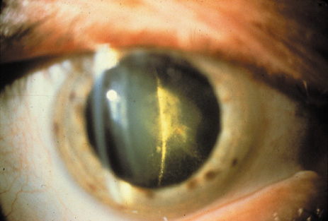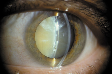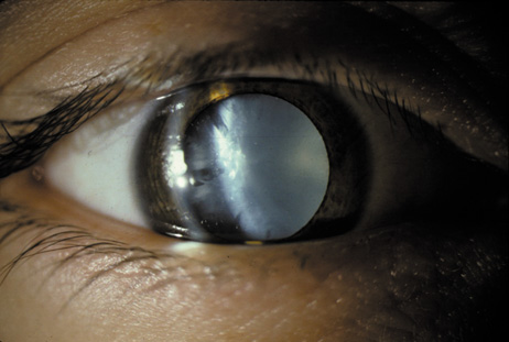 It has been observed that some individuals may have cortical opacities covering the entire anterior cortical and posterior cortical area (Fig. 11), and yet have 20/40 or better Snellen visual acuity under standard testing conditions. However, these patients may have severe disability glare such that under simulated bright lights their visual acuity may decrease to 20/80 or worse.31 They may also have decreased contrast sensitivity. These individuals tend to do well indoors but have difficulty driving during bright, sunny days, and at night because of oncoming headlights. Treatment in these cases must be decided on an individual basis, and surgery may be indicated when the expected benefits outweigh the surgical risks.