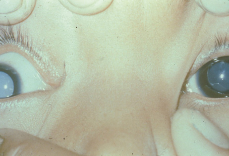 Stickler syndrome: Stickler syndrome, an AD disorder of connective tissue proteins, has multiple manifestations that affect the ophthalmic, orofacial, auditory, and articular systems. Micrognathia, depressed nasal bridge, and flat midface are the most commonly found orofacial features, and they tend to become less evident with age. Midline clefting may be of variable severity, ranging from a cleft soft palate to the Pierre-Robin sequence. Deafness may be present secondary to ossicle defects or sensorineural deficits. Joint hyperextensibility with later degenerative osteoarthropathy is also common.113,114 The most prominent ophthalmic manifestations are abnormalities of vitreous formation and architecture, and congenitally high myopia, which predispose to giant retinal tear formation and retinal detachment. Patients with Stickler syndrome may be more at risk of early-onset nuclear sclerosis and posterior subcapsular opacification.113 Congenital cortical cataracts may be present. These tend to be nonprogressive, and may have a curved113 or “wedge and fleck”114 distribution. |
