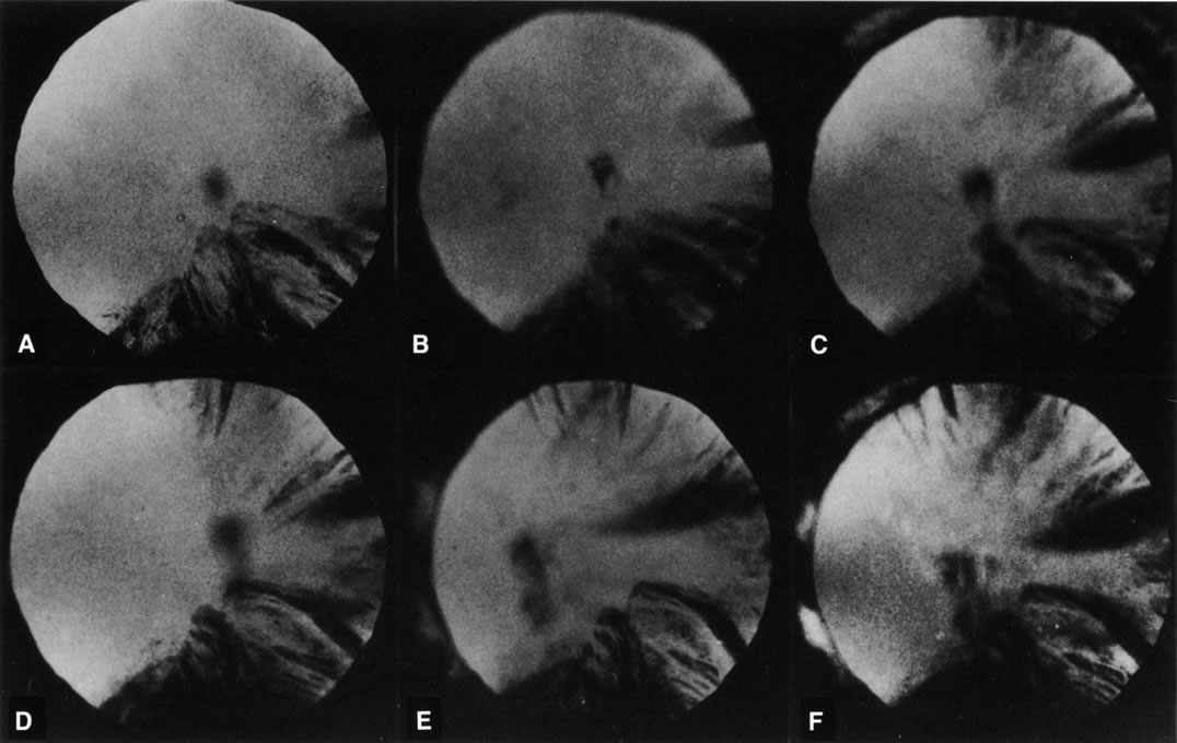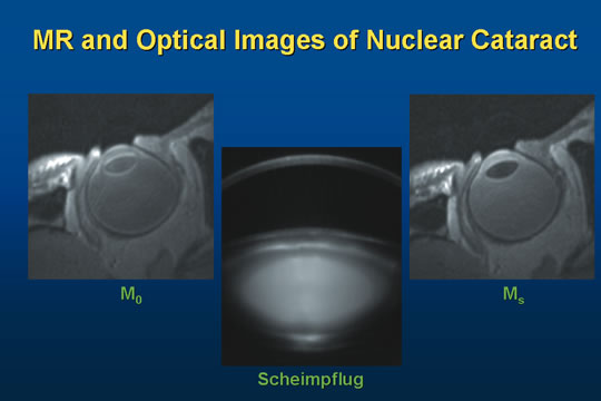 Clinically, DLS can be used to study cataracts noninvasively at the molecular level. It is safe and fast to use in early cataract evaluation because of the very low laser power (50–100 μW) and short data acquisition time (5 seconds). In a cold-induced cataract model experiment in which the cataract was simultaneously monitored with both the DLS device and Scheimpflug camera (Fig. 10), the DLS picked up subtle changes in the lens quicker (2–3 orders of magnitude earlier) than the Scheimpflug camera.66 The DLS measures the Brownian motion of the crystallins inside the lens. The major proteins that can scatter light in a human eye lens are α-, β-, and γ-crystallins. The α-crystallins are the largest molecules (molecular weight, 106 daltons) and they induce the greatest amount of light scattering in a DLS measurement. When these protein molecules aggregate, they give rise to lens opacities. For clinical use, DLS probes can also be integrated with slit-lamp, Scheimpflug, and autofluorescence instruments because of the current modular design. Data obtained from patients in clinical studies have shown good reproducibility.65,66 For clinical purposes, it has been suggested that the log 10 mean particle size be used as a clinical end point for this device.66 However, more studies are needed to further understand the wealth of data obtained with this device. Its application in eye research is just being explored, and much information can be obtained not only on the lens but also on the cornea,67 vitreous, and retina.68,69 Magnetic Resonance Imaging and Nuclear Magnetic Resonance Spectroscopy of the Lens As any other human tissue, the lens contains carbon and hydrogen atoms in which protons spin around their nuclei in random directions. On application of a magnetic field, these “microscopic magnets” are aligned in a particular (north-south) direction (higher energy state). On turning off the magnetic field, the microscopic magnets return to their original random state (lower energy state). The frequency of rotation is equal to the energy of a photon (normally a known radio frequency) that would cause the nuclei to flip between these two energy levels. This provides measurements of relaxation rates between different energy states of the nuclei in relation to the applied excitation photon field. Because they are dependent on the hydrogen nuclei densities in the tissue, the relaxation rate information can be translated into images. MRI provides the ability to probe the chemical and metabolic status of the lens noninvasively. Thus, in response to normal and pathophysiologic conditions, areas such as lens metabolism, ion concentrations, the state (bound versus free) of lens water, and metabolite and macromolecular motional dynamics may be investigated. Valuable biochemical and biophysical information pertinent to the factors that govern lens transparency, and conversely, the medical condition of the cataract can thus be studied. MRI has been used to image the eye but problems have been encountered including poor resolution; limited access to the surface coil and poor resultant magnetic signal (because of the location of the eye within the bony structure of the orbit); motion artifacts (caused by microsaccadic eye movements, breathing and heartbeat); and the presence of high susceptibility gradients around the eye. Recently, Lizak et al.70 used a special technique, magnetization transfer constant enhancement (MTCE), to enhance the lens image successfully and study diabetic and galactosemic animal models of cataract, and have applied it to clinical use. MTCE takes advantage of the magnetic interactions between water and macromolecule hydrogen atoms. Preliminary clinical studies suggest that cortical lens changes can be better observed with unenhanced magnetic resonance images, whereas nuclear lens changes are better observed by the addition of the MTCE preparation pulse (Fig. 12). MRI, therefore promises to be an imaging method independent of optical imaging that will allow clinicians to monitor metabolic processes in the lens.70 13C nuclear magnetic resonance (NMR) spectroscopy of the intact lens, on the other hand, has provided information about the production, turnover, and inhibition of sorbitol by aldose reductase inhibitors. Proton NMR spectroscopy of 13C-labeled metabolites offers the ability to monitor the reactivation and dynamics of the hexose monophosphate shunt (HMPS), a pathway important for the maintenance of the lens redox state, in real time and noninvasively.7131P NMR spectroscopy allows the monitoring of the phosphorus-containing metabolites, thereby permitting the real-time assessment of lens tissue metabolic response to pathophysiologic conditions. Important metabolites, such as adenosine triphosphate, phosphomonoesters, and phosphodiesters may be monitored. Furthermore, intralenticular pH may be measured. However, no clear correlation between phosphorus metabolite levels and lens clarity has been established to date, despite numerous NMR and classic biochemical studies. This lack of correlation suggests the importance of biophysical investigations aimed at the interaction behavior and organization of the constituent lens proteins in the cytoplasm, the macromolecular entities responsible for light scattering associated with cataract.72 NMR spectroscopy may be viewed as an important adjunct to the better established laser light scattering studies of the lens, and has remained mainly a laboratory, rather than a clinical, method of studying the human lens.72 Wavefront Technology Image degradation in the macula because of cataract may not only be caused by light scattering but also by optical aberrations. As discussed above (see “Visual Acuity/Function Tests”), several devices such as the Oqual and resolution test target test have been devised as simple ways to test for the effect of optical degradation in the retina. A new technology using wavefront analysis to study opti