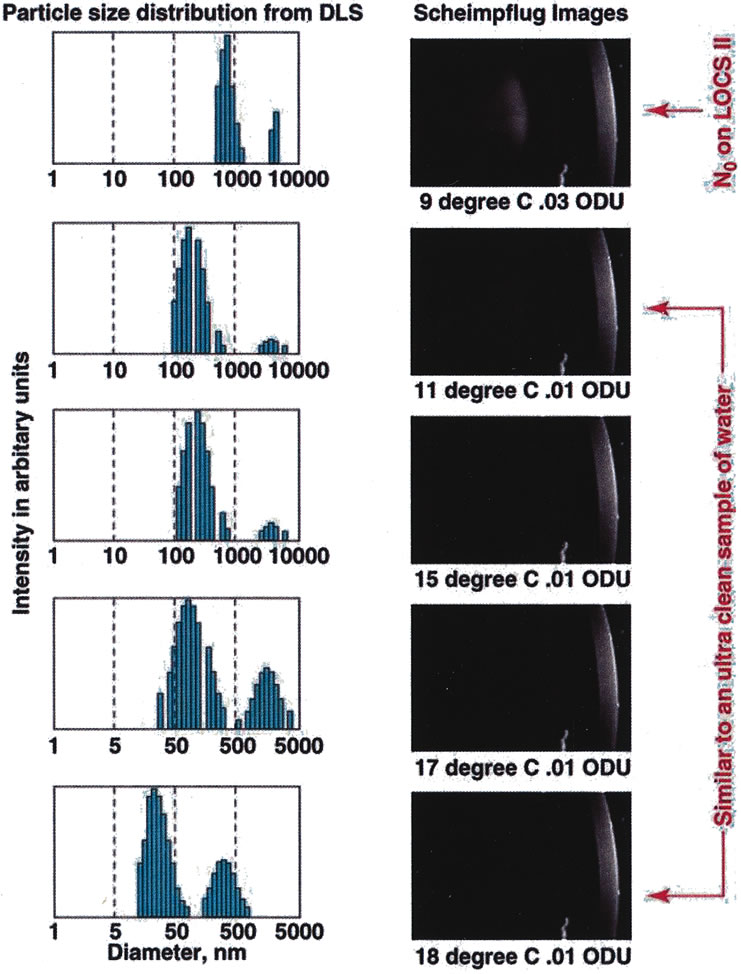 RETROILLUMINATION CAMERAS. Retroillumination cameras49,50 obtain images of cortical and posterior subcapsular cataracts as shown in Figures 1B, 7, and 8. These are useful for both cross-sectional and longitudinal studies. Various manual or automated methods have been developed or are being developed for the analysis of these images to determine the size of opacities. Usually, an artificial mask with a chosen diameter is used to standardize the area of interest in the image, and either a percent area or area in square millimeters is determined. Because of the variability of the background light (the images are shadows of the cataracts using light that is backlighted from the retina or optic nerve), densitometry is unreliable. Among the methods used include computer planimetry, counting boxes, manual and automated edge detection, and automated area analysis. This method is also being used to study IOL decentration and posterior capsular opacification after cataract surgery. Examples of this type of device are the Nidek EAS 1000 retroillumination unit (Nidek, Pasadena, CA), Oxford retroillumination camera (Marcher Ltd., Hereford, UK), and Topcon CTR (Topcon Medical Systems, Paramus, NJ). Other Specialized Slit-Lamp Imaging Systems Various innovators have devised specialized slit-lamp cameras with improved acquisition and image analysis of cataracts. The Laser Slit Lamp (Bausch and Lomb Surgical, San Dimas, CA)60 was developed to measure the density of nuclear cataracts. The Sequential Color Cataract Imaging System,61 provides three lens images for analysis: (1) saggittal sections of the lens, (2) retroillumination images, and (3) images of opacities obtained by direct or side illumination. These devices promise to be useful in clinical studies of the lens and cataracts but may need further development and standardization. In summary, the use of slit and retroillumination imaging coupled with a computerized analysis system is presently the state of the art in objectively measuring cataracts. However, because of the expensive equipment, the extra time, space, labor, and effort required, and limited practical clinical use, these systems are presently used mainly in clinical research settings. The clinical judgment of the ophthalmologist based on the history and eye examination remains the standard in clinical practice. NEW METHODS UNDER DEVELOPMENT New technologies are being applied in the study of cataracts and show great promise for providing new insights into the cataract problem, as well as new devices that a clinician can use with cataract patients in the clinic. In this section, the following devices are discussed: quasielastic or dynamic light scattering (QELS or DLS), magnetic resonance imaging (MRI), spectroscopy, wavefront technology, Raman spectroscopy, autofluorescence, and optical coherence tomography (OCT). These new noninvasive techniques add to the armamentarium available to cataract researchers. Steps being taken to develop these devices for noninvasive clinical use in vivo aim for their possible use on patients for diagnostic purposes in the near future. Quasielastic or Dynamic Light Scattering The intense scattering of light by a cataract arises from a change in the interaction and organization of the constituent particles/lens proteins mediated by lenticular stress. These changes in interaction and organization are reflected in altered motional dynamics (translational and rotational diffusion) of the lens proteins in the cytoplasm. The investigation of lens protein dynamics is being successfully accomplished by the use of DLS.62 DLS is an established laboratory technique to measure the average size or size distribution of microscopic particles (3 nm to 3 μm) suspended in a fluid medium in which they undergo random Brownian (or thermal) motion. Intensity of light scattered by the particles from a laser beam passing through such a dispersion will fluctuate in proportion to the Brownian motion of the particles. Because the size of the particles influences their Brownian motion, analysis of the fluctuations in scattered light intensity yields a distribution of the diffusion coefficient(s) of the suspended particles from which average particle size or particle size distribution can be extracted. In these experiments, visible light from a laser is focused into a small scattering volume inside a sample. The scattered light is collected using a photodetector (photomultiplier tube or an avalanche photodiode) and is processed via a correlator that yields a time correlation function (TCF). For dilute dispersions of spherical particles, the slope of TCF provides a quick and accurate determination of the particle's translational diffusion coefficient. This can then be correlated to the size of particles in the solution via a Stokes-Einstein equation, provided the viscosity of the suspending fluid, its temperature, and its refractive index are known.62-66 The distribution of particle size obtained from the tissues examined (such as the lens) can then be plotted (Figs. 10 and 11).