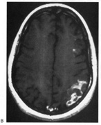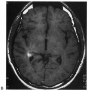 Fig. 7. Lesion of parietal optic radiation. A 35-year-old woman with 3 weeks of left-sided headache. A. Visual fields showed partial right inferior quadrantic defect. B. MRI showed infarct of parietal lobe, involving optic radiations. (From Rosen ES, Eustace P, Thompson HS, Cumming WJK [eds]: Neuro-Ophthalmology. London: Mosby, 1998.)