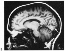 Fig. 10. Striate quadrantanopia. A. A 68-year-old woman with a stroke 3 years previously, causing left inferior quadrantanopia. B. MRI shows infarct of the superior bank of the right calcarine cortex.