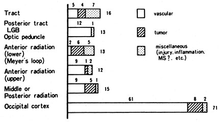 The differential diagnosis of optic radiation lesions reflects the variety of cerebral hemispheric pathologies. Unlike lesions of the optic tract, most are infarcts in the posterior cerebral or middle cerebral artery territories. Tumors, vascular malformations, infections, and leukodystrophies are also possibilities. The temporal profile of the illness often is the major clue to the etiology.