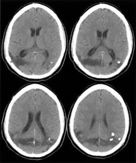 Trauma is another frequent cause of visual cortical lesions. Direct injury to visual areas occurs from open head injury with penetration of the skull from falls, falling objects, knives, bullets, or blows. Closed head injury may involve rapid acceleration and deceleration of the head, as in a fall or when the head strikes the dashboard in a car crash. The brain continues forward because of inertia, and then moves back in the opposite direction. A coup injury produces bruising on the side of the impact and a contrecoup injury on the opposite side. Thus trauma to visual areas may follow a blow to either the occiput or the forehead.