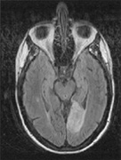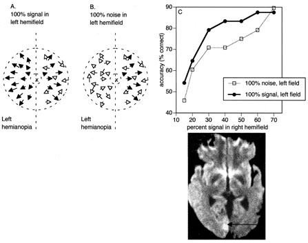 Fig. 5. Macula-splitting hemianopia. A 47-year-old man with AIDS and sudden onset of poor vision. A. Fields show complete left hemianopia. B. MRI shows lesion of right lateral occipital cortex, affecting distal optic radiations. Biopsy showed nonspecific encephalitis.