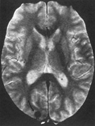 Fig. 4. Lesion of lateral geniculate nucleus (LGN). Slightly incongruent right sectoranopia along the horizontal meridian, with hemorrhage in the vicinity of the LGN. This field defect would result from damage to the midzone of the LGN. (From Rosen ES, Eustace P, Thompson HS, Cumming WJK [eds]: Neuro-Ophthalmology. London: Mosby, 1998.)