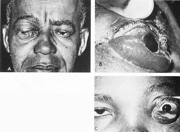 Cutaneovisceral hemangiomatosis (blue rubber bleb nevus syndrome; Bean's syndrome) is a rare congenital disorder with hallmark skin lesions (blue blebs) and gastrointestinal bleeding. The discrete venous malformations of varying size and appearance present as characteristic cutaneous lesions consisting of deep blue, soft, rubbery blebs, which are easily compressible. These malformations were described historically as cavernous hemangiomas, and inappropriately called hemangiomas. Ocular involvement includes lid blebs, iris and retinal angiomas,195 and orbital hemangiomas that may present with lid ecchymosis or intermittent proptosis,196 or intermitternt visual loss.197 VASCULAR DEFECTS RELATED TO TRAUMA The involvement of orbital veins with arteriovenous fistulas at the level of the cavernous sinus has been discussed previously. On rare occasions, shunts of the ophthalmic artery follow blunt or penetrating injury to the orbit itself. Orbital and ocular signs following such lesions are similar to those of carotid–cavernous fistulas. Internal carotid angiography shows enlargement of the ophthalmic artery and immediate opacification of either the superior or the inferior ophthalmic vein (Fig. 33). Posttraumatic arteriovenous shunts involving the intraorbital portion of the ophthalmic artery26 or its branches have traditionally been confused with primary arterial aneurysms of the orbit. The latter lesion is exceedingly rare. However, the case presented by Rubinstein and colleagues25 fulfills the angiographic criteria for acceptance. |