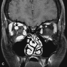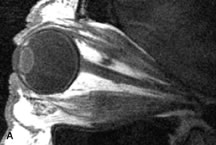 PATIENT PREPARATION Before MRI is performed, patients must be screened and prepared to avoid the potential hazards associated with the strong magnetic field. Patients who have ferrous aneurysm clips or cardiac pacemakers, who depend on life-support equipment, or who retain a possible metallic intraocular foreign body are not candidates for this imaging modality. MRI cannot be performed on obese patients who cannot fit into the bore of the magnet. Patients who are claustrophobic may not tolerate a prolonged period of study within the confines of the magnet, whereas others might do well if given a mild sedative. All worn metallic objects (e.g., necklaces, watches) should be taken off, credit cards set aside, and eye makeup removed before entering the room containing the magnet.5,20,34,35,36 NORMAL ORBITAL ANATOMY T1-weighted images provide the best anatomic details of the orbit because they display superior contrast resolution between normal structures (see Fig. 8). The vitreous has a long T1, resulting in an intermediate signal similar to brain, whereas the crystalline lens and sclera appear dark because of a longer T1 and short T2. The extraocular muscles, like all skeletal muscles, demonstrate a moderately long T1 and short T2 and highly contrast with the intense signal of the surrounding orbital fat (adipose tissue has an extremely short T1). The lacrimal glands appear as mottled areas of reduced intensity of the signal from the orbital fat in the lacrimal fossa. The optic nerves are seen with the same signal intensity as brain white matter and are hypointense relative to the orbital fat because their Tl is longer than the Tl of fat but shorter than the Tl of water. Cortical bone is not well delineated because it contains little free water, yielding minimal signal in MRI, and thus appears dark on all pulse sequences. This feature explains why MR images of the orbital apex and intracanalicular portion of the optic nerves are superior to comparable CT scans. Partial volume averaging of the bones in these regions obscures soft tissue details on CT images, whereas MRI reveals the signals only from the soft tissue structures with no cortical bone input. Bone marrow, on the other hand, is seen as a relatively intense signal because of its high fat content (see Fig. 8).37,38 T2-weighted pulse sequences are not ideal for imaging normal anatomy; however, they are particularly useful in revealing pathologic conditions (see Fig. 9). T2-weighted studies are most easily recognized by a bright vitreous signal. ORBITAL DISEASES Vascular Lesions Cavernous hemangiomas appear as well-circumscribed, smooth, usually intraconal masses that are isointense to muscle on T1-weighted images and hyperintense on T2-weighted images (Fig. 12). Patchy early enhancement is typically followed by diffuse, more homogeneous enhancement.39 The internal architecture of the mass, including septation and internal vasculature, may often be appreciated with high-quality orbital imaging.40 Lymphangiomas consist of ectatic vascular channels within a connective tissue stoma with varying degrees of lymphoid cellularity. On MRI, these tumors are typically poorly circumscribed, multicompartmental, and heterogeneous, often showing cystic dilations with fluid levels (Fig. 13). The signal characteristics within lymphangiomas vary considerably, reflecting cystic and solid components and the varying paramagnetic characteristics of blood at different stages of degradation.40–42 Acute hemorrhage appears hypointense on both T1- and T2-weighted formats. Methemoglobin present in subacute hemorrhage (3 to 14 days) leads to hyperintense signal on both T1- and T2-weighted images.41 A small percentage of lymphangiomas appear radiologically indistinct from orbital cavernous hemangiomas.43 Orbital varices are venous malformations that expand with increased systemic venous pressure, such as with Valsalva maneuvers. Because rapid acquisition of images during a Valsalva maneuver is important in imaging such a lesion, conventional or spiral CT is currently the modality of choice.44 MRI is an excellent modality for demonstrating enlargement of the cavernous sinus and dilation of the superior ophthalmic vein in patients with high-flow carotid-cavernous fistulas (Fig. 14).37MRA may be helpful in the evaluation of the venous outflow pattern. The rapidly flowing blood in these vascular structures carries the excited protons out of the section before they can be imaged, resulting in their dark appearance.5 In low-flow dural arteriovenous malformations, MRA may help define the arterial feeding vessels.45 Neural Lesions MRI is more effective than CT in delineating the intracranial optic nerves, chiasm, and optic tracts and, for this reason, is the preferred imaging modality in the evaluation of optic nerve disorders. The spatial relationships and image contrast of the orbital tissues with intraorbital optic nerve tumors is comparable between the two imaging modalities. The normal nerve is isointense to brain and appears enlarged and kinked owing to infiltration of an optic nerve glioma on T1-weighted images. Gliomas appear hyperintense on T2-weighted images and may be heterogeneous owing to cystic areas within the tumor. Contrast enhancement is variable.46 Intraorbital and intracranial optic nerve sheath meningiomas are usually isointense to cortical gray matter on Tl-weighted images and remain isointense on proton density studies (Fig. 15). Gd-DTPA is useful in delineating the intracranial extension of optic nerve meningiomas.7,47 The hyperostosis of bone and calcification associated with meningiomas are not demonstrated as well on MRI studies as on CT scans.20,37 Gd-DTPA–enhanced MRI also appears promising in the study of the permeability of the blood–brain barrier in selected optic neuropathies.22,48 MRI may reveal an enlarged optic nerve and some degree of contrast enhancement in cases of optic neuritis.49 Muscle Disorders Extraocular muscle enlargem