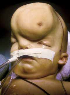 endoderm. A teratoma may become manifest at any age, but the majority are present at or shortly after birth. The tumor is rare,17–19 often only single cases being reported in large series of orbital tumors. Rarely is the presentation of other orbital tumors as dramatic as that of a teratoma, the eye seeming to be a mere appendage to the massive orbital component of the tumor (Fig. 5). CT imaging reveals the multicystic nature of these lesions and the often-encountered intracranial extensions.