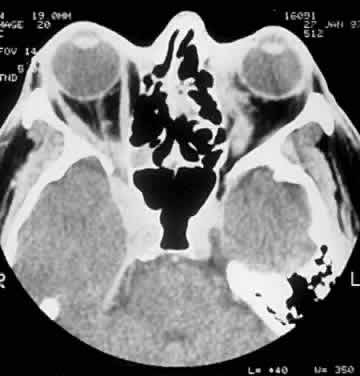 Two other intraosseous lytic histiocytic lesions occurring around the orbit have been described: the cholesteatoma and the giant cell reparative granuloma.192,193 Both lesions display proliferating histiocytes but no eosinophils. The cholesteatoma produces well-corticated lytic bone defects in reaction to local trauma (Fig. 28), whereas the giant cell reparative granulomas create a “zonal” pattern with areas of hemorrhage, fibrosis, and multinucleated giant cells.