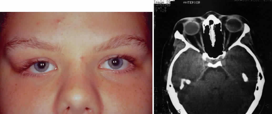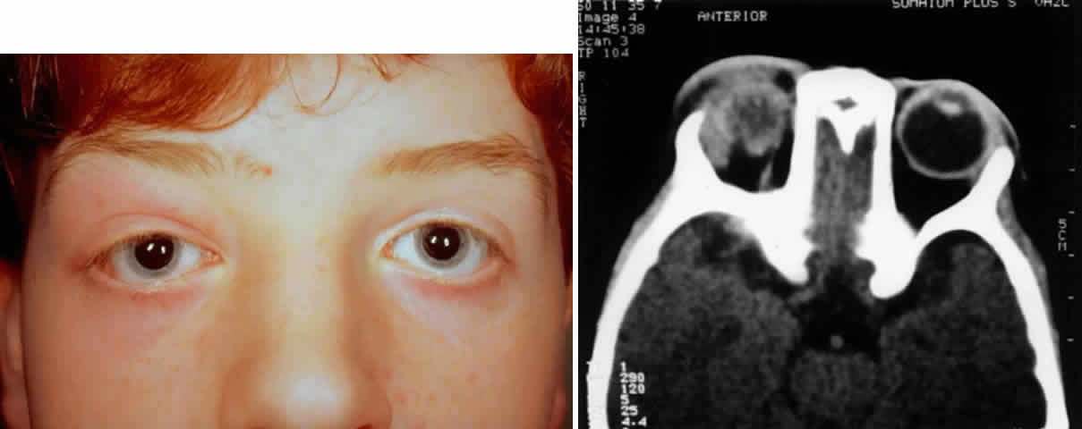 and tender. Often, mechanical ptosis and periorbital edema with erythema, conjunctival