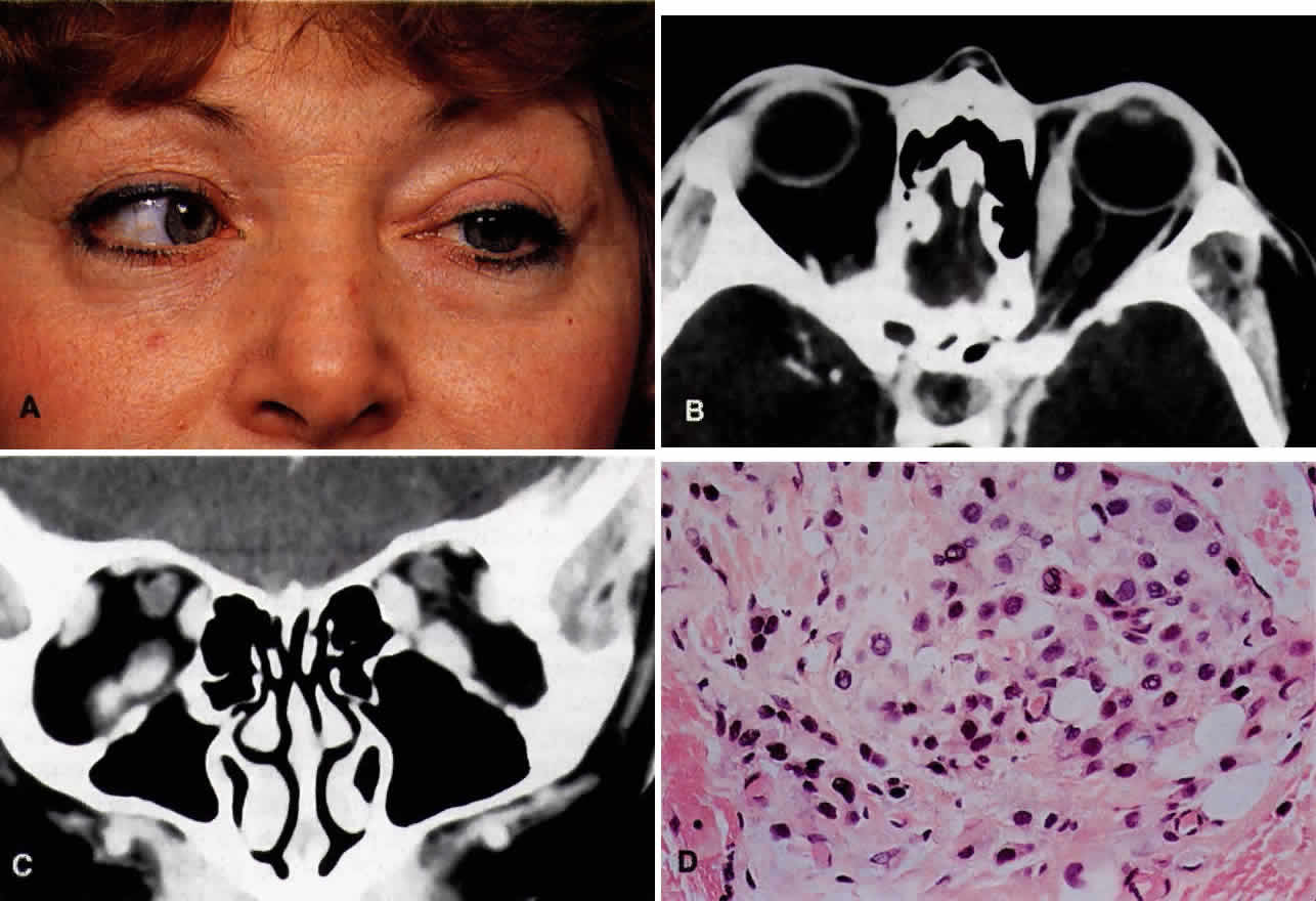 The orbit is at risk when tumors develop in the nasal cavity and paranasal sinuses because it shares three thin, bony walls with these structures: the roof, medial wall, and floor. These neoplasias can extend into the orbit by bony destruction, through suture lines and natural dehiscences of walls (i.e., lacrimal fossa, inferior orbital fissure, infraorbital groove, and pterygopalatine fossa), and via the emissarial blood vessels and nerves that perforate the orbital walls.4