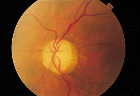 Occasionally, accumulations of inflammatory cells may appear white even in the absence of necrosis. Sheathing around retinal vessels (including the “candle wax drippings” seen in retinal sarcoid) represents a perivascular accumulation of inflammatory cells. Roth spots, which are white-centered hemorrhages, as seen in patients with bacterial endocarditis, are thought to represent the abscess within the hemorrhage. White-centered hemorrhages may occur in other conditions, and the explanation for the white center ranges from accumulations of leukemic cells to cytoid bodies. Duane and associates found fibrin and platelet aggregates in several patients with white-centered hemorrhages of various etiologies.11 Granulomatous inflammatory deposits often appear yellow to yellow-white, the clinical appearance of the Dalen-Fuchs nodule of sympathetic ophthalmia. Structures in the fundus may calcify, but the resultant white changes typical of calcium may be difficult to discern ophthalmoscopically because of the location of the calcium, viz., drusen of the optic nerve head. These calcific concretions are buried within the substance of the optic nerve head, usually anterior to the lamina scleralis (Fig. 28). They are covered by axonal and glial tissue together with the vascular supply of the nerve head. They are recognizable because of distortions in the shape of the disc, not the characteristic white color of the calcified lesion (Fig. 29). Drusen of the optic nerve head must not be confused clinically with papilledema (Figs. 30 and 31), with so-called “giant drusen,” which are glial hamartomata, or with drusen of the pigment epithelium, which are deposits of basement membrane material between the pigment epithelium and Bruch's membrane.