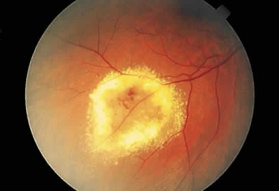 Necrotic retina has a white appearance. Necrosis may result from a variety of inflammatory conditions, including viral, fungal, and protozoal (Toxoplasma) retinitis. Each type of retinitis appears, in part, as a white retinal lesion. Cytomegalovirus retinitis (Fig. 24) resembles a pizza pie with an admixture of white (retinal inflammation) and red (hemorrhage) colors (Fig. 25). The retinal abscesses of fungal retinitis are white. Likewise, the satellite lesion of retinochoroiditis caused by active Toxoplasma (the choroidal inflammation is merely in response to the primary retinal infection) is white (Fig. 26). The white appearance of a lesion from inactive Toxoplasma results from the destruction of neurosensory retina, retinal pigment epithelium, and choroid to permit a direct view of the sclera (Fig. 27). Necrosis in retinal-derived neoplasms is white; the appearance of regressed (necrotic) retinoblastoma often is described as “cottage cheese.”10