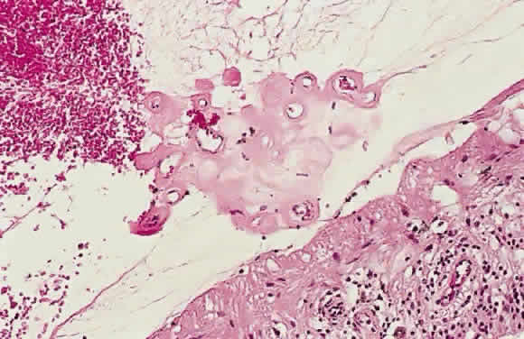 Fibrous tissue may originate from the choroid and proliferate through breaks in Bruch's membrane into the subpigment epithelial or subretinal spaces,4 hence the white appearance of disciform macular degeneration (Fig. 16). Fibrous tissue also may originate from fibroblasts located in the adventitia of retinal vessels and may contribute to the white appearance of vascularized membranes (Fig. 17A), such as those seen in proliferative diabetic retinopathy (see Fig. 17B) or arterioles after vascular occlusion (see Fig. 6). The accretion of collagen in the wall of the vessel in arteriolosclerosis may thicken the vessel wall (see Fig. 5) and alter the color of the blood column to a copper or silver color. Injury to the pigment epithelium results in scar formation (Fig. 18). Collagen deposition from pigment epithelium metaplasia may be identified by the presence of pigment within a scar (Fig. 19). Injured nonpigmented epithelium may undergo similar fibrous metaplasia and may contribute to the formation of membranes such as cyclitic membranes in the region of the ciliary body.
