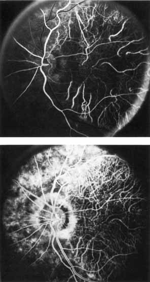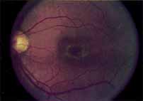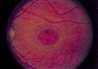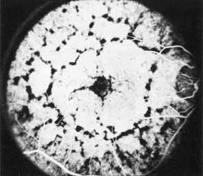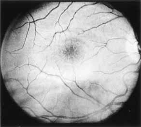 In the early stages of the dystrophy, the optic disc, retinal vessels, and peripheral retina are usually normal. The patient may have a visual acuity of 20/200 and normal color vision by standard testing and, yet, generalized cone dysfunction can be demonstrated by color field testing. In the late stages, there may be temporal optic disc pallor, attenuation of the retinal arterioles, and granular or bone spicule peripheral retinal pigmentary changes. Not infrequently, the peripheral pigmentary abnormalities may be regional. This probably reflects regional rod involvement, as evidenced by ERG, which may demonstrate a reduction in amplitude without a change in latency of the rod responses.72,80 At this stage, contracted peripheral fields may be found on both white and color target testing. No medical treatment is available. The prognosis for vision is guarded and poorer than for the other cone dystrophies because both cone and rod function is impaired in the macula and retinal periphery. Accordingly, central vision is decreased and color vision impaired in association with contraction of the peripheral visual fields. As the dystrophy progresses, vision may decrease to the 20/400 level or less and may also be accompanied by contracted peripheral fields and a total color defect. Patients with poor central vision should be referred to low visual aids. Severe photophobia in adults and children has been reduced with the use of appropriately tinted spectacles or contacts. The tint will often depend on the dystrophy as some patients with relatively well-preserved color vision require neutral tints and other more severely affected patients require red tints similar to those in rod monochromats. Miotic drops have been used in some patients with severe photophobia but are not generally well tolerated or advised. Ancillary Tests Fluorescein angiography demonstrates increased transmission of choroidal fluorescence in the macula during early phases of the study, without late leakage of dye or fluorescein staining. In addition, an annular pattern of hyperfluorescence is often seen in the macula, highlighting the bull's-eye pattern seen on fundus examination (Fig. 4). Visual field defects include central scotoma, peripheral field loss, and ring scotoma.