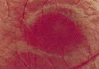 Ancillary Tests Fluorescein angiography during the early stage of the disease demonstrates either a hypofluorescent lesion or, more typically, a small irregular ring of hyperfluorescence surrounding a central hypofluorescent spot (Fig. 27), a finding we have called the corona sign. While somewhat irregular in appearance, the areas of surrounding hyperfluorescence usually display a definite radial or spoke-wheel pattern visible in at least one eye. It is this angiographic pattern in particular that indicates that this entity shares significant characteristics in common with the other pattern dystrophies of the retinal pigment epithelium. Color testing demonstrates a mild tritan defect, while visual fields may reveal a small central scotoma.