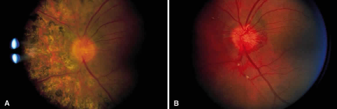 Fig. 7. A. Neovascularization of the disc. Notice the segmental exudative arteriolar sheathing. B. Same patient as in Figure 7A, 2½ years later. The patient had regression of the neovascularization after treatment with scatter photocoagulation of nonperfused retina. Areas of arteriolar sheathing previously observed are no longer present.