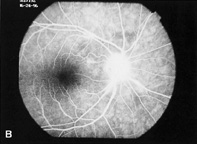 retinovascular features. This syndrome typically affects young healthy individuals with a female preponderance. Despite the significant retinal findings, patients often are asymptomatic at presentation. In the largest series of 10 patients, all three features described by the acronym IRVAN were required for diagnosis.133 This includes the presence of numerous aneurysmal dilations of the optic nerve head and retinal arterioles at or near their major branching sites. The aneurysms measure between 75 and 300 μm in diameter and may have a triangular, Y-shaped or coiled configuration. Aneurysmal changes at the optic nerve head may be associated with ectatic changes and apparent elongation of the adjacent arteries (Fig. 15A). The vascular abnormalities in IRVAN have a propensity to leak, leading to exudative retinopathy, but do not have a predisposition to hemorrhage. Subretinal, intraretinal, or vitreous hemorrhage secondary to aneurysms has not been associated with IRVAN. This is contrasted with senile acquired macroaneurysms, which occur in older individuals with systemic hypertension, are round, and may be associated with either hemorrhage or serous exudation. IVFA is useful to delineate aneurysmal changes in IRVAN. Vasculitis is demonstrated by staining of the arterial and venous walls on IVFA, and the arterioles appear to be more severely affected (see Fig. 15B). Neuroretinitis is manifested clinically as optic nerve head swelling and as late diffuse staining of the optic nerve head on IVFA. Extensive peripheral retinal capillary nonperfusion with sequelae of retinal ischemia, such as neovascularization of the retina or anterior segment, may occur. Vitreous hemorrhage may occur secondary to retinal neovascularization. Vitritis has been described in IRVAN and may be accompanied by anterior uveitis. IRVAN is differentiated from Bales' disease, which has a predilection for young male patients, an association with tuberculin hypersensitivity, more marked uveitis, retinal venous inflammation, and a lack of multiple macroaneurysms.133 Although some cases of IRVAN maintain good visual acuity, severe visual loss may result from exudative maculopathy or sequelae of retinal ischemia. Extensive medical investigations have not revealed any systemic associations. Systemic corticosteroids do not appear to have a beneficial effect on uveitis or retinal ischemia. There is limited experience regarding laser photocoagulation to aneurysms to treat eyes with exudative retinopathy threatening the fovea. Branch artery occlusion was described in one case after laser photocoagulation to a single aneurysm.133 Chang and colleagues recommend observing eyes without retinal neovascularization and performing panretinal laser photocoagulation for eyes that have developed retinal neovascularization or have signs of rapidly progressive anterior segment ischemia.133 Vitrectomy has been performed for eyes with persistent vitreous hemorrhage. |