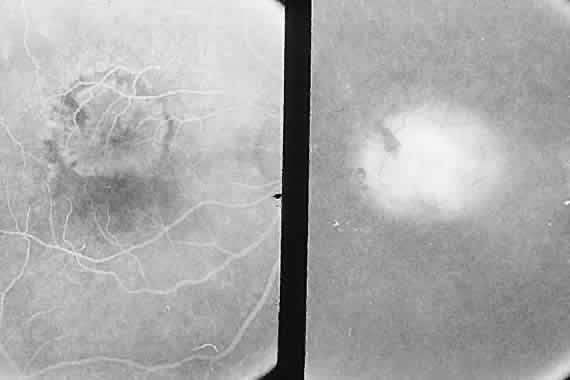 Atrophic macular degeneration may evolve in several ways. Areas of RPE atrophy often follow the fading of drusen. Dystrophic calcification may also be seen in soft drusen. Eventually, the overlying RPE atrophies.21 Initially, these areas form discrete patches of atrophy that coalesce with time. The areas initially affected usually involve the perifoveal area and spread around the fovea, preserving central vision. However, in most cases, with time the fovea is involved and central vision is lost.7,39 Macular atrophy may occur in the absence of faded drusen. The RPE atrophy may be preceded by a reticular configuration of pigment clumping. The atrophy tends to expand more rapidly in all other directions than toward the fovea.39 However, although the fovea shows a certain amount of resistance to the expansion of atrophy, it is ultimately involved, and in most cases central vision is lost. Occasionally, a bull's-eye ring of atrophy surrounds the fovea before the center is involved. This foveal sparing may be due to an accumulation of lipofuscin in the posterior pole or possibly to the presence of xanthophyll pigment.7 The progression of atrophy is variable, ranging from 15 to 375 μm a year.39 Geographic atrophy may follow the spontaneous or laser-induced collapse of a serous pigment epithelial detachment, especially when formed by a confluence of soft drusen.7,49,33,36,39,49,50 In areas of geographic atrophy, the outer nuclear layer rests directly on the basal lamina. The outer plexiform layer is thinned and vacuolated, but the inner nuclear layer is less affected. The choroidal capillaries remain patent for a time, but in long-standing RPE atrophy, they end abruptly at the end of the atrophic area. The gradual obliteration of the choriocapillaris that follows RPE atrophy can be seen clinically as slow filling on fluorescein angiography that, in time, progresses to nonfilling.51 In cases of long-standing atrophy, choroidal arteries may appear to be sheathed, prompting the name choroidal sclerosis. Histologic examinations, however, reveal only a fibrous replacement of the arterial media, without thickening of the walls; the lumen remains patent.7 Choroidal atrophy occurs secondary to a reduction in nutritional demands of the outer retina. As the choriocapillaris and middle layer of choroidal vessels are lost, the larger choroidal vessels become more prominent. Functional visual loss can result from a ring scotoma, despite good Snellen acuity. It takes approximately 10 years from the onset of atrophic change to reach a level of 20/200, although an interval of 5 years has been observed between the time of atrophic foveal encroachment and the loss of fixation.7,52 Each year, 8% of eyes decrease from 20/50 or better to 20/100 or worse.39 There is a great tendency for the areas of atrophy to become bilaterally symmetric with time. Also, SRNV can develop at the border of atrophic RPE, especially if there is a ring of soft drusen around the geographic atrophy. Because the neovascular response requires the presence of degenerating RPE, the SRNV is almost always found at the edge of atrophy rather than in the center of an atrophic area. SUBRETINAL NEOVASCULARIZATION The Eye Disease Case-Control Study Group showed that there is an increased risk to progression to SRNV if there is a history of cigarette smoking, elevated serum cholesterol, and multiparity.53 A protective effect of carotenoids was also found. Serum levels of vitamins E and C were not associated with the risk of progression to SRNV.54 SRNV refers to the growth of abnormal new vessels beneath the sensory retina or RPE. Choroidal neovascularization, another term for SRNV, emphasizes the choroidal vascular origin of the new vessels.55 SRNV is an abnormality found in many diseases in which the integrity of the RPE, Bruch's membrane, and choriocapillaris has been compromised.56–59 The effect on vision from SRNV derives from its tendency to leak fluid beneath and into the sensory retina, to bleed, and to create a fibrovascular disciform scar in the macular region. Patients with AMD often develop SRNV and initially present with blurred or distorted vision, micropsia, or scotoma.60 Clinically, the subretinal neovascular membrane may appear as a dirty-gray discoloration beneath the retina and may be accompanied by an overlying sensory retinal detachment and cystoid edema. A pigmented ring may encircle the membrane, caused either by RPE hyperplasia or pigment ingestion. Often subretinal or sub-RPE hemorrhage is present. In the absence of retinal vascular disease, trauma, or a choroidal tumor, subretinal hemorrhage should be considered to be caused by SRNV until proven otherwise. Rarely, hemorrhage from SRNV may dissect through the retina to create a vitreous hemorrhage. Occasionally, SRNV can be responsible for a turbid sensory retinal or RPE detachment. Turbidity indicates the presence of proteinaceous exudate, fibrin, and blood, all products of abnormally leaking vessels. Subretinal exudate is also a strong indicator of SRNV. If the RPE overlying the SRNV membrane has become thinned, then the arborized vascular structure of the membrane may be seen.61 The presence of a pigment epithelial detachment may also signal the presence of an SRNV membrane, especially if associated with sensory retinal detachment, subretinal exudate or blood, chorioretinal folds, or an RPE tear.16,17,43 Subretinal or sub-RPE blood in the pigment epithelial detachment is also a sign of associated SRNV. The blood and proteinaceous content in a pigment epithelial detachment stains slowly with fluorescein compared with the rapid angiographic staining of a serous pigment epithelial detachment. Fluorescein angiography is useful in confirming the presence and location of SRNV, which provides information concerning visual prognosis. The early angiogram in classic CNV may reveal a discrete, lacy, arborized plexus of vessels, with a nodular-appearing border (Fig. 7). The edges of 