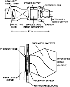 headlights or street lights. Fig. 19 illustrates a schematic model of a hand-held monocular pocketscope that is about 4 in. long. The instrument provides a patient with a 40-degree field of view and gives the patient his or her best daylight vision at night in one eye; it has a green display. This monocular device can be head mounted. Monocular devices are most useful in patients with a best corrected vision of better than 20/200 and a visual field diameter of greater than 20 degrees in at least one eye. Candidates considering a monocular device should also have good mobility in daylight with one eye patched. Patients who depend heavily on a far temporal crescent for mobility are not good candidates; nor are patients who, because of a central scotoma, cannot view the output screen in these devices. The patient should be advised to assess the value of the device for routine activities before making a decision as to whether or not to obtain it. A new generation night-vision device is presently being field tested. This binocular electro-optical device (about 1.25 in. thick) is worn like a pair of glasses. This instrument uses digital amplification and has a black and white display. It is connected to a powerpack that can be carried in the patient's pocket or attached to a belt. This instrument has a 40-degree field of view. It remains to be determined whether this binocular night vision aid will be more helpful than a handheld monocular device for patients with retinitis pigmentosa and other night blinding retinal disorders. |