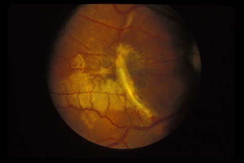 RETINITIS SCLOPETERIA Retinitis sclopeteria is the rupture of the choroid or retina caused by shock waves generated by passage of a high-velocity missile through the orbit without directly striking the eye. Initially a subretinal or vitreous hemorrhage is seen. If the optic nerve is damaged, visual acuity can be profoundly decreased. In severe cases, massive amounts of fibrous tissue proliferate into the eye (Fig. 27). In others, as the blood clears, a claw-like break is often seen in Bruch's membrane and in the choriocapillaris (Fig. 28). Retinal detachment rarely occurs at the site of the injury, probably because of binding of the retina to the choroid by fibrous tissue, but late detachment from a break at a distal site can occur.97,98