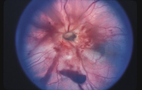 The prognosis for recovery of useful vision in a ruptured globe is very poor, even with current vitrectomy techniques, because the underlying choroid and retina are also torn. Fibrovascular tissue proliferates into the eye and causes severe massive periretinal proliferation. Although most eyes usually only have one rupture, the authors and others93 have seen eyes with more than one. OPTIC NERVE INJURIES The optic nerve can be severely damaged by blunt trauma, although the precise mechanism is not known. Possible mechanisms include compression by intrasheath hemorrhage and edema and direct shock-wave trauma to the nerve fibers. The management of traumatic optic neuropathy is controversial. The only prospective, controlled, randomized trial, the International Optic Nerve Trauma Study, failed because of inadequate recruitment.94 Many authorities advocate high-dose intravenous steroids, especially if they can be started within 8 hours. Other treatments that are based on CT findings include surgical decompression of optic nerve sheath hematoma and neurosurgical decompression of the optic canal.95 However, two recent studies did not show that any of these treatments improved visual outcome.94,96 Another severe complication of blunt trauma is evulsion of the optic nerve (Fig. 26). Although this usually is accompanied by severe damage to other ocular tissues, it can be the sole manifestation of apparently minor direct trauma or even a blow to the occiput.