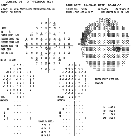 Localized glaucomatous loss typically occurs asymmetrically and often involves only one hemifield. Therefore, comparing the differential light sensitivity of corresponding regions of the two hemifields may highlight an early abnormality of the visual field.45 One available hemifield comparison test is Humphrey Statpac 2 software. The Statpac 2 hemifield test compares the probability values from the pattern deviation map at five regions in each hemifield. Fields are classified as normal, borderline, or outside normal limits. The Statpac 2 hemifield test also indicates when significant generalized reduction of sensitivity or abnormally high sensitivity is present.46