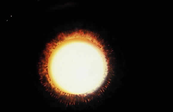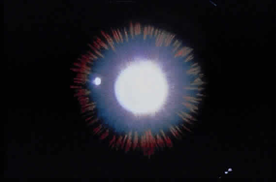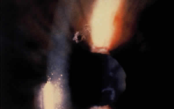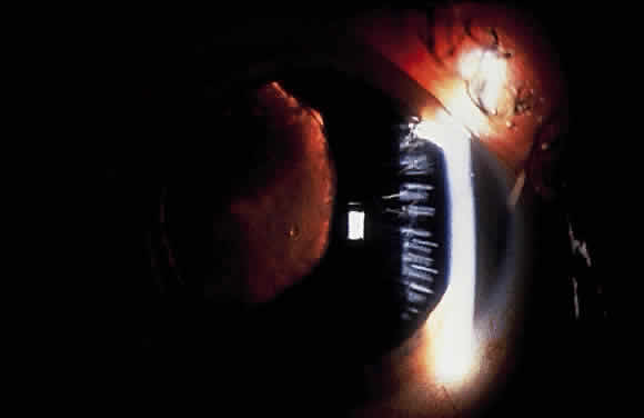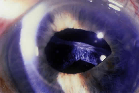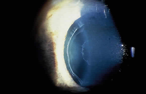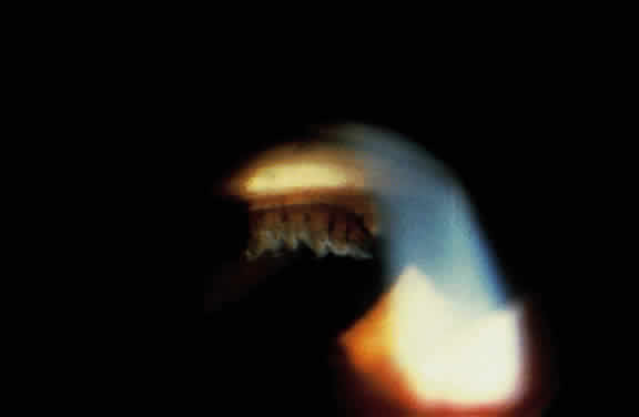 Fig. 3. Subluxated lens in an eye with exfoliation syndrome. (Courtesy of Dr. Ronald Gross, Cullen Eye Institute, Houston, TX)