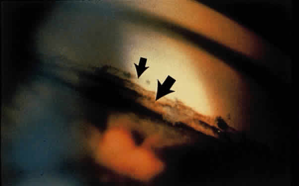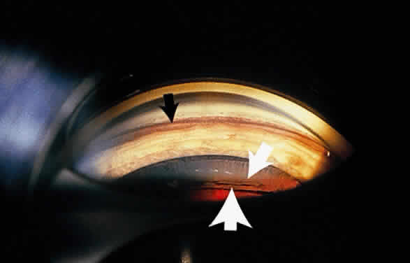 Fig. 7. Patchy hyperpigmentation of trabecular meshwork (large arrow) in exfoliation syndrome. Faint pigment on Schwalbe's line represents a Sampaolesi's line (small arrow). Also notice exfoliative deposits in angle. (Van Baskirk EM: Clinical Atlas of Glaucoma, p 53. Philadelphia, WB Saunders, 1986)
