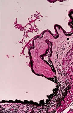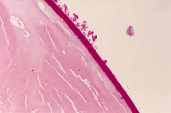 Fig. 9. Deposition of fibrillar eosinophilic material on anterior lens capsule in exfoliation syndrome (PAS, × 250). (Courtesy of Dr. Marilyn C. Kincaid and Armed Forces Institute of Pathology, Washington, DC)