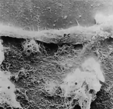 Fig. 10. Scanning electron micrograph showing layer of anterior lens capsule and exfoliative material (PC) peeling back from rest of capsule. Asterisks indicate exfoliative vegetations (× 5340). (Dark AJ, Streeten BW, Cornwall CC: Pseudoexfoliative disease of the lens: A study in electron microscopy and histochemistry. Br J Ophthalmol 61:466,1977)