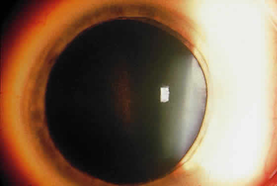 Fig. 14. Vertical accumulation of pigment in central corneal endothelium (Krukenberg spindle) in pigmentary glaucoma.