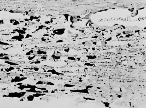Accumulation of exfoliative material may be detected histopathologically throughout the anterior segment to include the lens, iris, trabecular structures, conjunctiva, ciliary body, and zonules. The deposition of fibrillar eosinophilic material on the anterior lens capsule is the classic histopathologic feature of XFS (Fig. 9). Ultrastructural studies also indicate some degree of actual exfoliative changes or peeling of the anterior lens capsule74 (Figs. 10 and 11). In addition, Ashton and associates describe a degenerative band containing exfoliative material within the inner half of the lens capsule.5 Bertelsen and coworkers independently noted projection of coarse fibrils from the lens surface into the deep portion of the lens capsule to form an amorphous layer of the lens capsule between the lens epithelium and normal lens capsule.6 Thus, studies indicate that exfoliative material accumulates on the anterior lens surface but also that the lens capsule itself may be involved, and that the underlying epithelial layer may at least partially contribute to the production of the exfoliative material.