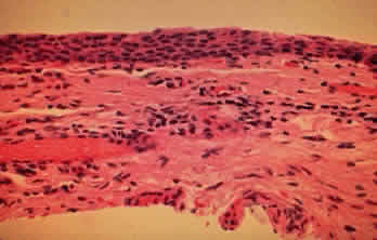 A practical approach to the problem of drug-induced conjunctival scarring is to discontinue the topical agents, if this can be done, and follow the patient for progressive conjunctival shrinkage.25 If the drugs are absolutely essential to control glaucoma, they should be continued. If progressive conjunctival shrinkage occurs, the patient probably has CP and immunosuppressant therapy may be warranted. The determination of whether these drugs simply cause scarring that mimics CP or whether they cause or promote CP in a particular patient can be made only by long-term follow-up after drug discontinuation for the development of chronic, progressive conjunctival shrinkage or the development of extraocular lesions. HISTOPATHOLOGIC FINDINGS Cicatricial pemphigoid is characterized by subepithelial blisters or bullae. Electron-microscopic studies show that the separation at the margin of a blister is located within the lamina lucida between the plasma membrane of the basal cells and the electron-dense lamina densa.5 The conjunctival epithelium in CP shows squamous metaplasia, with parakeratosis and keratinization (Fig. 7).26 Mucus-producing goblet cells are scarce or lacking.11,27 Because the mitotic rate of conjunctival epithelium is higher in patients with CP, it has been suggested that CP is associated with hyperproliferation of the conjunctival epithelium, with a failure of conjunctival differentiation because of reduced goblet cells.28 In the early stages of conjunctival disease, granulation tissue is found beneath the conjunctival epithelium, with an infiltration predominantly of lymphocytes and plasma cells, with occasional eosinophils and relatively few neutrophils.13,26 Later, pronounced fibrosis takes place in the conjunctival stroma and is responsible for the conjunctival shrinkage that characterizes the disease.9,10 Hyperproliferation of conjunctival fibroblasts from patients with CP has been demonstrated in tissue culture.29 One study described perivascular inflammatory cell infiltration in 20% of specimens and substantial mast cell participation and degranulation.4 In addition to the chronic inflammatory cells typical of CP, conjunctival biopsy specimens from patients with acute manifestations of CP show numerous neutrophils within and beneath the conjunctival epithelium (Fig. 8).15