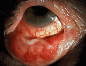 Conjunctival or corneal bullae have been described10 but are rarely observed, perhaps because they rupture readily because of the blinking action of the eyelids. Breakdown of the corneal epithelium most commonly results from entropion with trichiasis; lagophthalmos with abnormal blinking and exposure; and a diminished, unstable tear film. These erosions may become complicated by secondary bacterial infiltrates and ulcers. Predisposing factors for the development of microbial keratitis include topical corticosteroids, bandage contact lenses, trichiasis, corneal surgery, lagophthalmos, and meibomianitis.12 Corneal neovascularization may develop either as a pannus or pseudopterygium. Smears of conjunctival scrapings from patients with CP reveal neutrophils, keratinized squamous cells, and eosinophils.13 In a study of the bacterial flora of patients with CP, potential pathogens—mainly mannitol-positive staphylococci—were recovered from the eyelids and conjunctiva of 81% of patients with this disease.2 Glaucoma may be more prevalent in patients with CP.14 COURSE OF OCULAR DISEASE Cicatricial pemphigoid generally runs a chronic course, characterized by progressive shrinkage of the conjunctiva. When the end stage of this disease is reached, the eye lacks tears and has obliterated conjunctival fornices, ankyloblepharon, and a keratinized ocular surface epithelium. Episodes of acute disease activity may interrupt this chronic progressive course and result in rapid shrinkage of the conjunctiva.15 Acute disease activity may be precipitated by surgical procedures, including conjunctival biopsy, lysis of symblepharon, oculoplastic procedures on the eyelids, and cataract extraction. The acute manifestations consist of localized, ulcerated conjunctival mounds (Fig. 4) or diffuse, severe conjunctival hyperemia and edema (Fig. 5). Before concluding that acute inflammatory activity is caused by the disease process, it is necessary to eliminate other confounding factors such as trichiasis, exposure, or bacterial blepharoconjunctivitis.