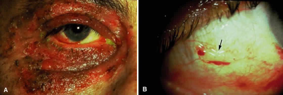 Rupture of the bullae leaves an inflamed, painful hemorrhagic base with a white pseudomembrane. Over the course of 1 week, epithelialization occurs. The process may involve the external hares, pharynx, larynx, trachea, bronchi, and esophagus. Except for the conjunctiva, mucosal and cutaneous lesions usually disappear without scarring. Esophagitis with stricture formation has been reported, however.98 Complications of EM major include pneumonitis, septicemia, myocarditis, myositis, and glomerulonephritis. The reported mortality is less than 1% for EM minor and 2% to 25% for EM major.99 About 20% of EM patients develop recurrences.99 Recurrences are more common with the minor form of EM. OCULAR INVOLVEMENT The acute phase of ocular disease lasts 2 to 3 weeks.100 The eyelids are swollen, ulcerated, and crusted. Conjunctival vesicles have been reported101,102 but are rarely noted. Conjunctival involvement ranges from a mild catarrhal conjunctivitis, which terminates without sequela, to pseudomembranous or membranous conjunctivitis, which may involve both the palpebral and bulbar conjunctiva.103 Purulent conjunctivitis may develop secondary to bacterial infections.100–102 The severity of late ophthalmic complications depends more on the severity of systemic disease and conjunctival involvement than on the local treatment.104 In other words, patients with pseudomembranous or membranous conjunctivitis tend to develop late ophthalmic complications. The conjunctival surfaces of patients with membranous or pseudomembranous conjunctivitis may heal, leaving scarring, symblepharon, and even ankyloblepharon (Figs. 15 and 16). Late complications of conjunctival scarring include entropion with trichiasis and lagophthalmos with exposure.