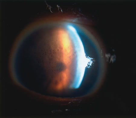 The prevalence of pseudophakic corneal edema is decreasing because of several factors. Surgical technique improvements and anterior chamber lens advancements have resulted in fewer complications. In addition, posterior chamber lenses have become the standard of care in modern cataract techniques and now comprise approximately 95% of the entire intraocular lens market share.105 Improved surgical technique, better microsurgical instrumentation, more biocompatible irrigating solutions, and acceptance of viscoelastic materials have contributed to less pseudophakic corneal edema. Despite these improvements, the increasing number of cataract surgery cases and an enlarging elderly population will likely make pseudophakic corneal edema a problem for some time. Vitreoretinal Surgery The use of silicone oil and perfluorocarbon gases in retina and vitreous surgery can cause corneal edema following retinal detachment repair procedures. One study found 50% of patients developed irreversible corneal decompensation within 2 weeks following silicone oil injection.106 Migration of oil or gas into the anterior chamber mechanically damages the endothelium and blocks aqueous nutrients from reaching the endothelium, both of which cause endothelial cell loss.107 Phakic and pseudophakic individuals with intraocular silicone oil fare better than aphakic individuals because a barrier is present to block oil or gas migration into the anterior chamber. An inferior iridectomy in cases of silicone oil retention and aphakia can limit access of silicone oil into the anterior chamber by allowing normal aqueous flow through the iridectomy site.108 Refractive Surgery Several studies have shown that refractive surgery procedures can cause a variable amount of corneal edema. Incisional refractive surgery, such as radial keratotomy, may be associated with diurnal variation in corneal thickness due to increased corneal hydration with the lids closed at night. One study on rats following excimer laser keratectomy (photorefractive keratectomy) showed increased apoptosis of corneal keratocytes and endothelial cells for both superficial and deep stromal ablation patterns.109 Other studies have demonstrated development of transient corneal edema or interface fluid and microcystic edema following laser-assisted in situ keratomileusis (LASIK).109–111 Corneal endothelial analysis following LASIK verified pleomorphism with definite loss of endothelial cells and altered cell morphology acutely.112 Although these changes have proven transient, additional observation of similar phenomena must continue in the future as refractive surgery procedures continue to be performed in an increasing number of patients. Corneal Trauma/Intraocular Foreign Body External trauma to the cornea as mentioned earlier can damage the endothelium, causing corneal edema that may or may not resolve. Penetrating corneal injuries can damage the endothelium, more or less depending on the nature and extent of the injury as well as the health of the endothelium. Ballottement of a foreign body on the endothelium may cause more damage to the cornea than the initial passage of the foreign body through the cornea or the surgical trauma required to extract the foreign body. A foreign body that has lodged in the inferior angle of the anterior chamber can cause progressive corneal edema that begins inferiorly.113 When a particle penetrates the cornea and becomes lodged in the angle, it may be difficult to see with gonioscopy or through the microscope at the time of surgery. A careful history of penetrating injury should be elicited, especially in the case of a glass foreign body. Metallic foreign bodies that enter the eye are more likely to show up on x-ray or computed tomography scan. Fresh shards of metal may be more difficult to remove than initially anticipated because the rough surface of the metal easily incarcerates into iris and stromal tissue. Optimum treatment for metallic foreign bodies is surgical removal as soon as possible. NONMECHANICAL DAMAGE TO THE ENDOTHELIUM Certain ophthalmic conditions unrelated to trauma can stress the endothelium and create corneal edema. Conditions such as chemical injury, uveitis, glaucoma, or hypoxia can all create edema, although if caught early, the edema may be reversed. In more advanced cases of endothelial cell damage, penetrating keratoplasty may be necessary to reestablish normal corneal physiology. Early removal of the offending agent can improve the prognosis and may reduce the need for surgical treatment. Chemical Injury Chemical injuries, such as those caused by acid or alkali burns, are well-known causes of corneal endothelial destruction. Acid or alkali burns that change the pH of the corneal endothelium outside of the normal range of 6.8 to 8.2 damage the plasma membrane and decrease the effectiveness of the barrier function. Likewise, acid or alkali can decrease the amount of bicarbonate buffer in the corneal stroma and temporarily or permanently reduce the pump function. Inflammation Anterior segment inflammation may cause endothelial dysfunction, resulting in stromal and epithelial edema. The clinical presentation and course of the inflammation depend on the severity of the inflammatory process, its duration, and the health of the endothelium. Mild uveitis in a patient with Fuchs' dystrophy or glaucoma may cause severe, irreversible corneal edema. In the presence of a healthy endothelium, mild anterior uveitis usually does not cause corneal swelling. Chronic insidious uveitis, which is granulomatous in nature and characterized by the deposition of mutton-fat keratic precipitates on the endothelium, can cause corneal edema. Postoperative inflammation also can cause corneal edema in the early postoperative period, when the endothelium is more vulnerable.80 Chronic granulomatous uveitis that induces corneal edema may be caused by a number of diseases, including herpes simplex, herpes zoster, and sarcoidosis). Incre