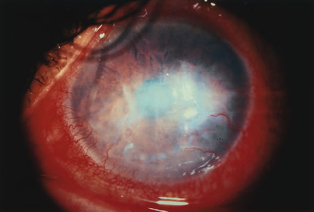 In stage 2, patients have painless decrease in vision and symptoms of glare and halos around lights, which are usually more severe on awakening. These symptoms are primarily caused by varying degrees of epithelial and stromal edema. Epithelial edema can be seen as small droplets (bedewing) on slit lamp retroillumination. Decreased evaporation of tears during sleep causes increased tear osmolarity and promotes increased edema and decreased visual acuity on awakening. Stage 3 develops after epithelial microcysts coalesce to form bullae. The bullae eventually burst and produce varying amounts of pain, hence the name bullous keratopathy (Fig. 7). Wrinkles in Descemet's membrane known as striae develop as the cornea thickens posteriorly because of stromal swelling. These striae form when the cornea swells as a result of shortening in the arc of Descemet's membrane from limbus to limbus. As the microcystic epithelial vesicles break, foreign-body sensations and severe pain ensue along with more extensive corneal epithelial disruption. Recurrent corneal erosions, microbial ulceration, and persistent pain may occur during this stage.