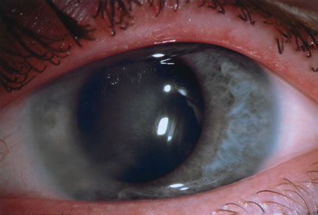 HISTOPATHOLOGY. The underlying pathology of PPMD is found in both Descemet's membrane and the endothelium. Electron microscopy has confirmed the presence of epithelial-like cells within focal areas of the endothelium.59–61 These cells possess multiple characteristics of epithelial cells, including shape, multilayering, presence of microvilli, cytokeratin-positive intermediate filaments, and desmosomes.56,62 Additional electron microscopy studies depict abnormalities in Descemet's membrane. PPMD has a normal anterior banded zone of 3 μm in adults, but the posterior nonbanded zone is either absent or multilaminated, resembling the anterior banded zone. Descemet's membrane also develops excavations of its posterior surface that fill with collagenous material, appearing as the vesicular lesions seen on slit lamp examination.56 Recent reports of a family with PPMD linked the disorder to the long arm of chromosome 20 (20q11).63 TREATMENT. Most cases of PPMD involve asymptomatic patients with stable disease courses. These patients have no need for therapy. In the small number of cases with progressive, vision-threatening forms of PPMD with corneal edema necessitating surgical management, penetrating keratoplasty is the procedure of choice. In 1985, Krachmer56 reported a series of 13 PPMD patients (20 eyes) undergoing penetrating keratoplasty. The study averaged 4.75 years of follow-up and found 50% of patients attained a visual acuity of 20/40 or better and 50% had clear grafts postoperatively. Congenital Hereditary Endothelial Dystrophy HISTORY. This rare corneal dystrophy was first described by Laurence64 in 1893 as “corneitis interstitialis in utero,” but became known as congenital hereditary endothelial dystrophy (CHED) in the 1960s.65–67 The bilateral, symmetric congenital disorder causes corneal opacification from limbus to limbus, without clear regions. Maumenee65 was the first to suggest that the disease occurs as a result of dysfunctional endothelial cells. CLINICAL MANIFESTATIONS. CHED most commonly presents as gray-white diffuse corneal clouding within the first 6 months of life (Fig. 11). The corneal diameter and IOP are normal, with no signs of inflammation or vascularization. CHED can be inherited in an autosomal dominant or autosomal recessive fashion. The autosomal recessive form presents at birth, rarely progresses, is asymptomatic, and is associated with nystagmus. The autosomal dominant type appears at age 1 or 2 and has fewer changes present at birth. It is slowly progressive, lacks nystagmus, and is commonly associated with photophobia and tearing. The stromal edema in this type is more transient in nature. The differential diagnosis should include sclerocornea, dermoids, Peter's anomaly, congenital glaucoma, forceps trauma, mucopolysaccharidoses, congenital infections, and rarely PPMD.68
