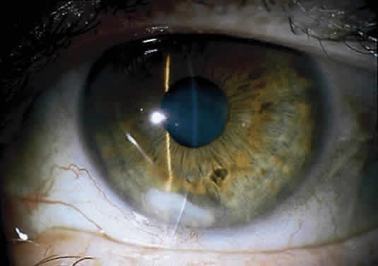 Streptococcus viridans (alpha streptococcus), although of low-grade pathogenicity, may be a cause of corneal ulceration, particularly in the locally immunosuppressed host.42 The organism produces a characteristically indolent, anterior stromal inflammatory reaction that is slow to progress and that may be accompanied by a minimal to moderate anterior chamber reaction. The ulcer is usually well circumscribed, gray-white, “dry” in appearance, and lying beneath a well-demarcated epithelial defect (Fig. 6). Because the organism is of relatively low-grade pathogenicity, the infection responds rapidly to specific antibiotic therapy.