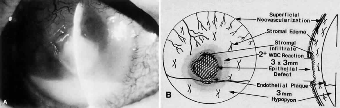 to eliminate portions of the diagnostic plan. The symptoms of corneal ulcers are similar in most patients, but may differ depending on the severity of the infection. They include decreased visual acuity, photophobia, pain, redness, swelling, and discharge. The severity may vary in relation to the underlying causative organism, the condition of the host, and the duration of the symptoms before the patient is examined. The initial clinical examination should be thorough and should include evaluation of the lids and conjunctiva as well as the cornea, anterior chamber, and posterior segment of the eye. All periocular and ocular abnormalities, including intraocular pressure, should be accurately documented at this examination. In general, patients presenting with bacterial corneal ulcers develop moderate to severe lid and conjunctival edema and inflammation as well as a purulent discharge. A papillary conjunctival response predominates, but may be masked by chemosis. The corneal epithelium becomes ulcerated, and the underlying stroma shows a dense, gray-white, necrotic-appearing infiltrate. The borders of the epithelial defect are sharply defined, but the edges of the stromal infiltrate are indistinct and often extend beyond the epithelial defect. White blood cell infiltration and edema of the cornea surround the ulcer, and fibrin plaques may be present on the endothelium. The anterior chamber reaction may range from mild to severe, but is considered to be sterile so long as Descemet's membrane remains intact. A hypopyon may be present and is the result of the toxic effects of the organism on the vessels of the iris and ciliary body. The severe inflammatory reaction from virulent bacterial corneal ulcers may lead to the development of cataracts, anterior and posterior synechiae, elevated intraocular pressure, descemetocele, perforation, and permanent scarring and edema of the cornea. Although these clinical findings are widely observed in most bacterial corneal ulcers, clinical features that frequently characterize certain groups of infecting bacteria are worth noting. The recognition of these features may be helpful in attempting to determine the responsible causative organism early in the management of the ulcer. In general, Gram-positive cocci such as Staphylococcus aureus and Streptococcus pneumoniae produce round or oval ulcers that are gray-white and dry in appearance, with distinct borders (see Fig. 5). These organisms almost always produce a severe anterior chamber reaction, particularly in the case of pneumococcal ulcers, in which a sterile hypopyon frequently occurs. The Gram-negative rods, however, usually produce a more profuse, wet or soupy appearing infiltrate that is rapidly progressive and spreads to involve the entire cornea (see Fig. 9). The mucopurulent discharge produced by Pseudomonas aeruginosa typically is yellowish-green and clings tenaciously to the ulcer's surface.25 The anterior chamber reaction produced by the Gram-negative rods also is quite intense and includes hypopyon formation. During the initial clinical examination of the patient, a detailed drawing should be made of the corneal ulceration (Fig. 10). This drawing should include accurate measurements of the size and shape of the epithelial defect and stromal infiltration using the slit beam ruler (Fig. 11). An estimation should be made of the relative density of the stromal infiltration and the surrounding white blood cell reaction, as well as the depth of the stromal infiltration and appearance of the infiltrate borders. In addition, careful attention should be paid to the anterior chamber reaction, including keratic precipitates on the endothelium. Documenting these specific findings at the initial examination is important for providing a “starting point” or basis against which daily comparisons can be made once treatment has commenced (see Therapeutic Approach). The use of slit-lamp photography also can be extremely helpful in documentation and comparison of the changing characteristics of the ulcer.