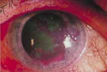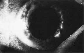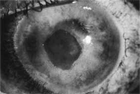 Anterior uveitis is invariably present although it may be difficult or impossible to assess because of the corneal opacification. In severity it varies from the presence of an occasional cell and minimal flare to the development of hypopyon. Posterior synechiae and rubeosis iridis frequently complicate severe cases. The intraocular pressure may be elevated in the acute stage as a result of an associated trabeculitis. Vascularization can occur at any stage of the disease process. Vessels penetrate the stroma from the limbus at all levels to invade the active stromal lesion. They are often cuffed by fine granular infiltrates while active but, as the inflammatory process subsides, they lose the cuff of cells and may eventually become almost bloodless. The first signs of a recrudescence of inflammation may be the reactivation of these vessels. During the acute stages of the inflammatory reaction, scarring may not be obvious, but as the signs of inflammation subside, it becomes more apparent. In the early stages the discrete white opacification may easily be mistaken for infiltrate. Once significant scarring has occurred, the clarity of the cornea is permanently impaired (see Fig. 20). Loss of corneal substance, ranging from minor faceting to gross thinning or even perforation, is of variable occurrence. It often relates to preceding dense infiltration and is most frequently seen in the rebound phenomenon following withdrawal of topical steroid therapy for stromal herpetic keratitis with dense infiltration (Fig. 26).